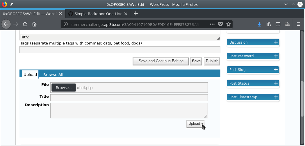 A shell.php was uploaded, once inside the Wordpress admin panel.