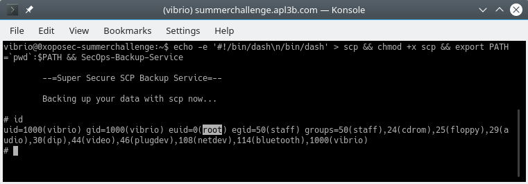 echo -e '#!/bin/dash\n/bin/dash' > scp &&