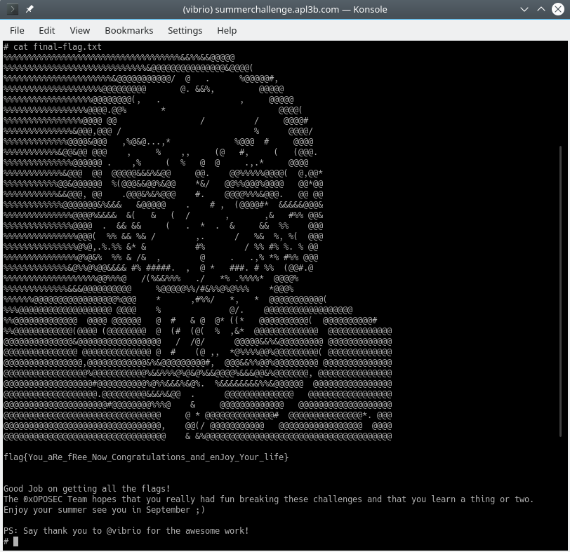 Last flag!!! flag{You_aRe_fRee_Now_Congratulations_and_enJoy_Your_life}.