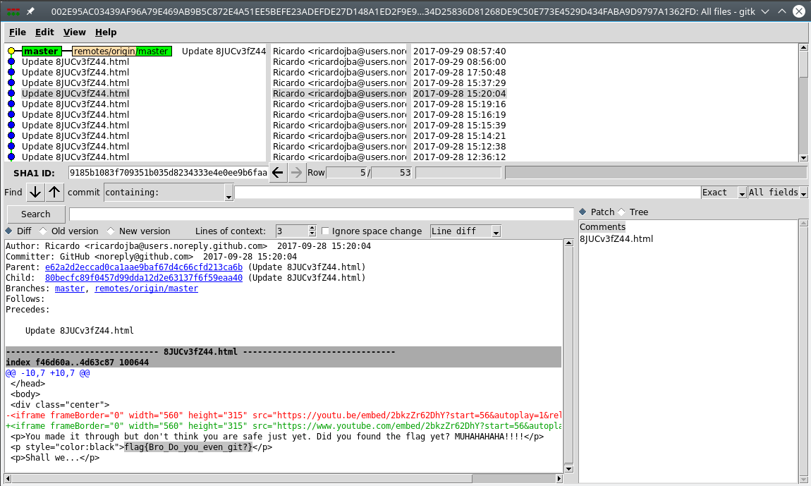 Running through the list, there was a commit containing the flag. flag{Bro_Do_you_even_git?}