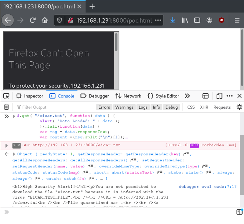 Therefore I created a POC page containing an iframe pointing to an EICAR page (it has to be on the same domain, which I will explain later).