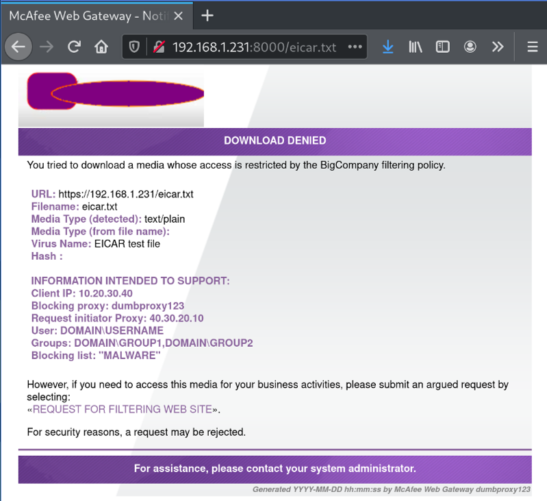 Let’s check the McAfee Web Gateway output when opening an EICAR file.